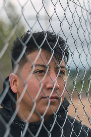 Play with me. Earnest determined guy staying behind fence and staring at camera
