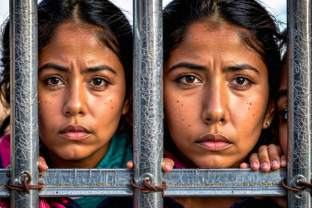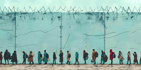 Thousands of people with suitcases and backpacks wait at a border, navigating fences as they seek safety and a better future.