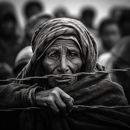 Crowd of asylum seekers at barbed wire border a symbol of immigration and borderline struggles