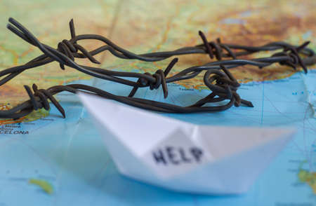 White paper boat onto world map with Help sign on it and barbed wire.