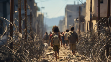 Refugees who were left without shelter and livelihood against the background of a city destroyed as a result of the war, and barbed wire. AI generated.