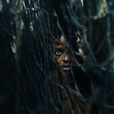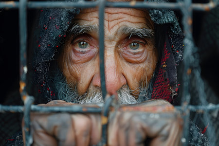 A man is seen inside a cage, his hands pressed against his face in distress or anguish. The confinement and emotional turmoil are palpable in this scene. Generative AI