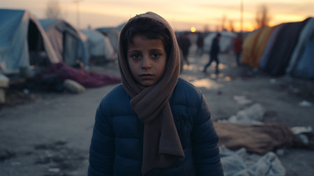 Refugees kid portrait. Homeless child at the camp background
