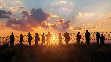Silhouette of crowd of refugees or illegal immigrants stands by barbed wire border, concept of crossing the border, - ai