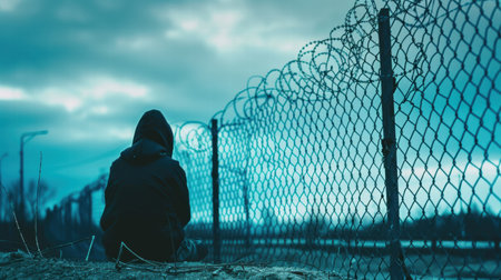 Single migrant stands near border fence, conveying emotional and physical barrier, representing forced migration, danger and international conflict.