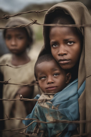 A poignant depiction of a refugee mother and her children near a border fence, conveying themes of displacement, hope, and resilience.