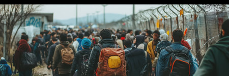 Refugees carrying belongings walk together along a border, facing barriers yet filled with hope amid overwhelming challenges.