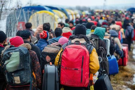 Large groups of people with backpacks and suitcases gather at a crowded border, facing challenges and searching for hope and safety.