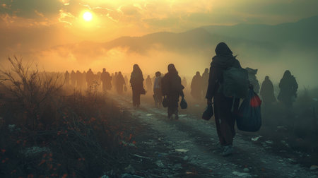 A family of refugees walks along a dusty road at sunset, carrying their belongings. The poignant image symbolizes migration, displacement, and the hope for a new beginning. The setting sun casts long