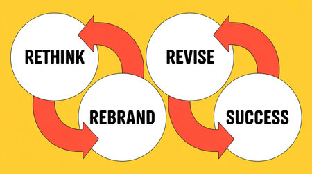 Four white circles labeled Rethink Revise Rebrand Success arranged in a loop with red arrows on a yellow...