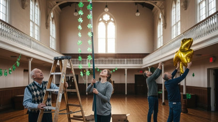 A cinematic wide environmental photograph taken inside a spacious community public hall. The scene c
