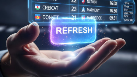 A hand holds a glowing holographic refresh button above a digital data display. Clear details and...