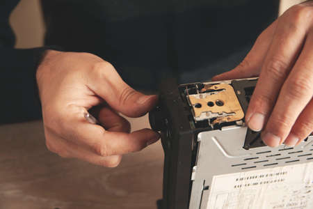 A man is repairing a Smartphone. Hands hold a screwdriver and disconnect the sim card loop. Services Repair. Selective focus.