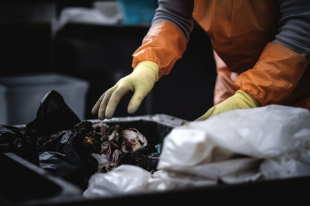 closeup shot of a person wearing gloves while sorting through garbage, created with generative ai