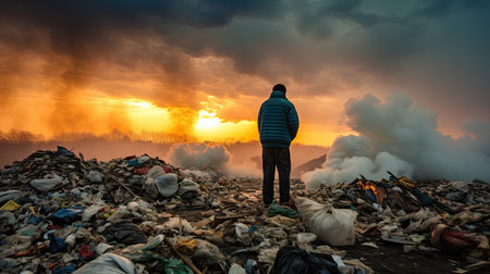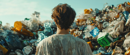 A person stands in front of large pile of waste, showing commitment to recycling and environmental protection