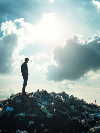 A person stands atop a mountain of plastic waste at a landfill, emphasizing the urgent need for sustainable waste management solutions.