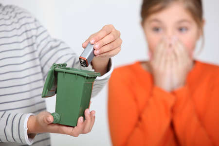 Closeup of a boy putting a battery in a miniature bin much to the horror of his sister