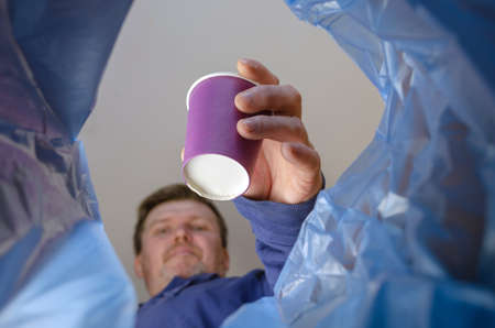 A hand throws a paper cup into the trash can. Man holds lilac disposable cup over garbage basket. View from below. Indoors.
