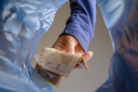 The hand throws money in the trash. A man is holding several Ukrainian hryvnia over the trash garbage can. Inflation, bankruptcy, obsolete money, concept. Bottom view.