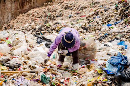 Researcher looking at plastic landfill analyzing environmental pollution level