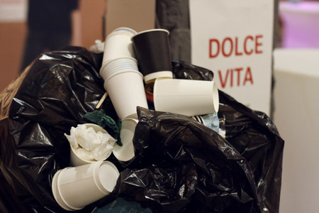 Trash many paper used cups in black bag and text dolce vita in background in blur