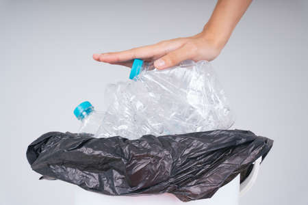 Woman hand putting plastic bottle in resue or recycling in trash rubbish bin.