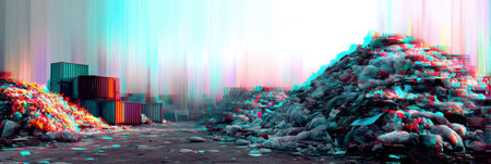 Trash piles clutter an urban area, distorted by a glitch art technique, showcasing digital pollution in a harsh, impactful manner at twilight.