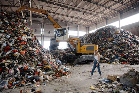 Nature pollution activist at a huge trash dump - Young blonde woman - Looking at all the human waste and plastic in our world - Tractor operating in the background in Eastern Europe Latvia Riga