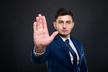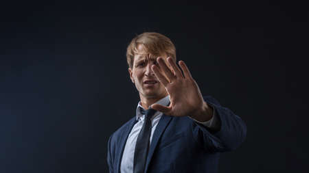 Attractive businessman rising his palm up and doing stop gesture on dark background