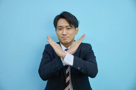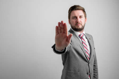 Stop it, a young male businessman in a suit and tie makes a gesture of protest.