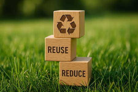 Reduce Reuse Recycle text on wooden blocks, spreading the classic sustainability mantra. Waste reduction concept.