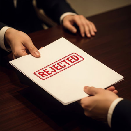 A hand passes a document with a red REJECTED stamp to another hand. This symbolizes disagreement, failure, a rejected proposal, or a failed deal.