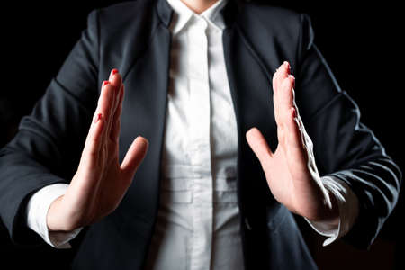 Businesswoman Holding Important Message Between Hands. Woman In Suit Showing New Crutial Idea Among Palms. Executive Presenting Updated Critical Information.