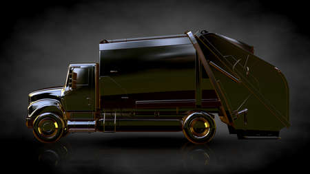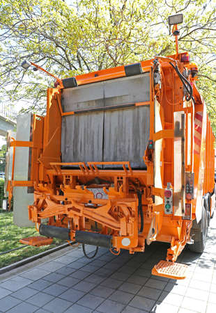 Garbage truck. Orange garbage truck. Urban recycling waste and garbage services