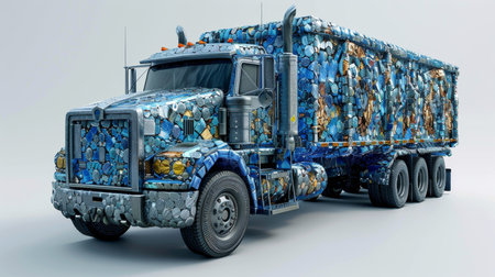 An old truck made of construction debris stands on a white background. 3d illustration.