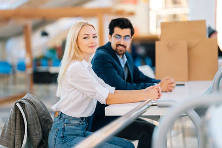 Beautiful young man and woman waiting coffee, resting sitting at table in mall after shopping at mall, looking at camera. Pretty couple relaxing after shopping in cafe, paper bags on table.