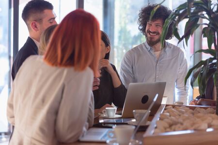 Beautiful business people are using gadgets, talking and smiling during the conference in office