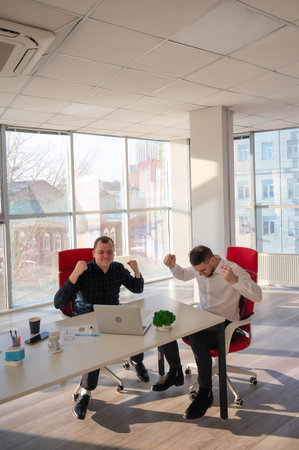 Low angle portrait of two smiling men communicating and holding mobile devices in office building setting