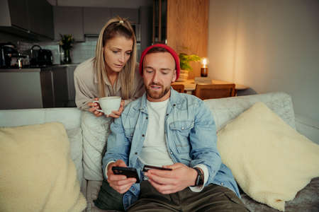 Caucasian happy couple relaxing at home sitting on sofa making card payment