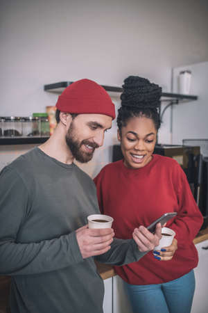 Colleagues having coffee in the office kitchen and having a lively conversation