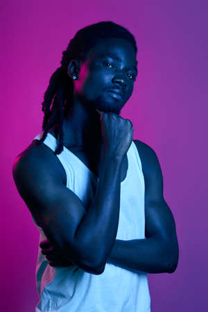Stylish smile african american man rapper with dreadlocks at violet wall background