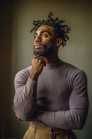 Confident African American man in a fitted purple sweater poses with arms crossed, highlighting his stylish look and thoughtful expression in a softly lit setting