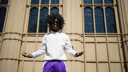 Brutal rich african rapper with raised hands in city