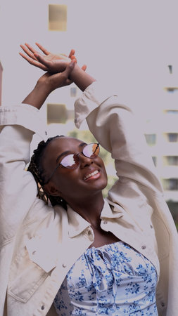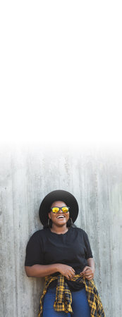 Banner beautiful African American hipster millennial girl is looking at camera and smiling wears sunglasses and hat while standing against wall, vertical copy space and empty space for text