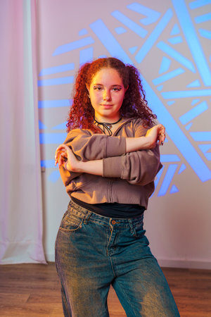 Young woman is standing with her arms crossed, looking confident and self-assured