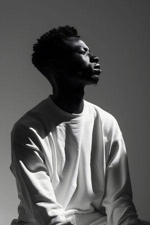 African man in white shirt, deep in thought under dramatic monochrome lighting