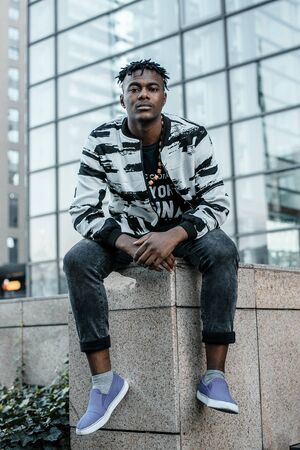 Rich african american man rapper with sunglasses in city