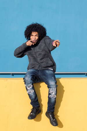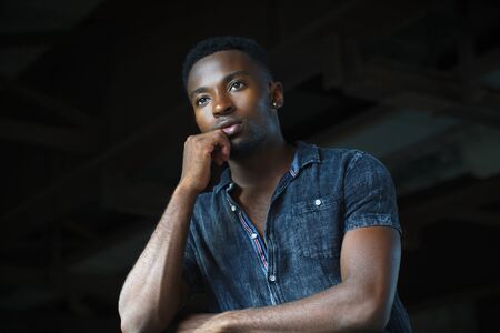 Portrait of young attractive stylish african american man model posing in casual clothes against neutral background looking sexy with afro hair. In People Youth Beauty and fashion concept.