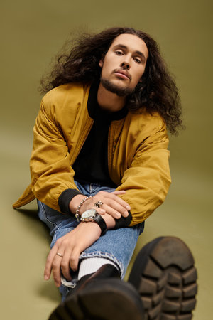 relaxed male model in yellow vest and jeans posing on floor with arms on knees, fashion concept