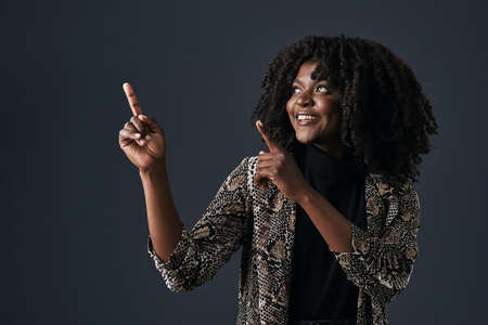 Fashionable african american woman in leather jacket posing isolated on dark grey